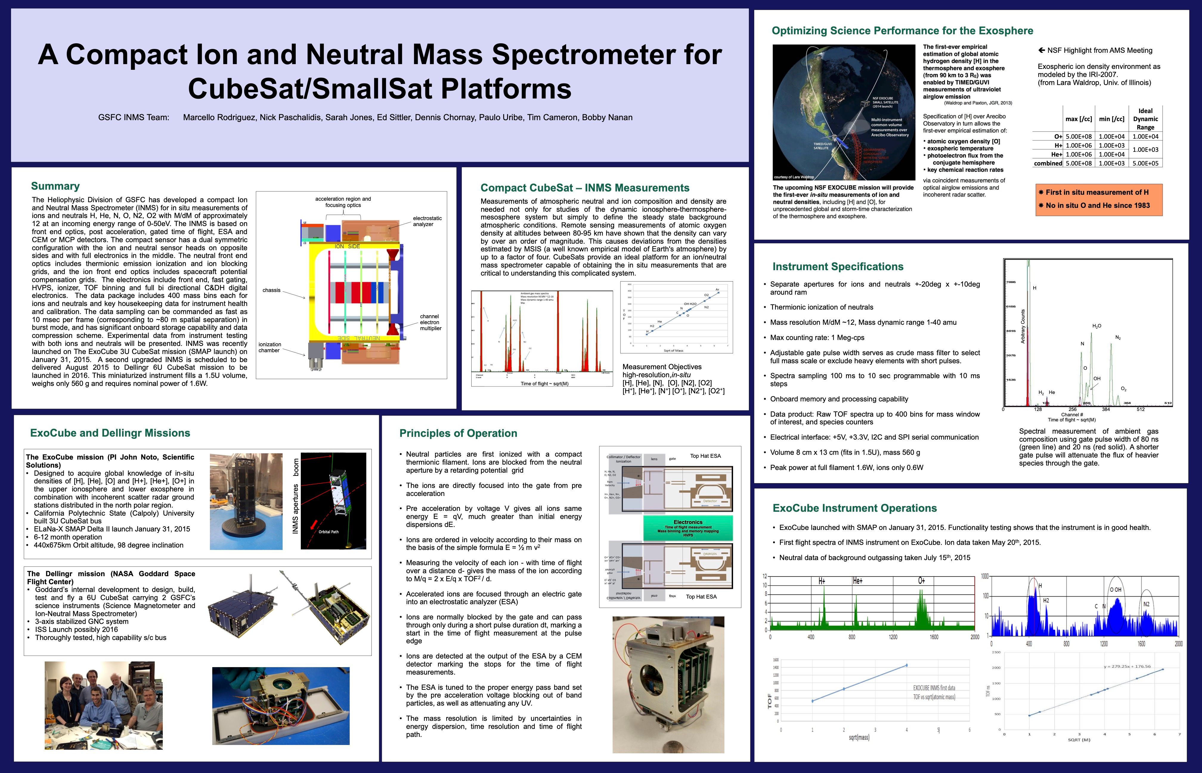 The INMS and Mini-INMS is a time of flight (ToF) mass spectrometer (thermoinic emission ionization, pre-acceleration gated ToF and ESA, CEM/MCPs) that measures Ion Species in the atmosphere and ionosphere including H+, He+, N+, O+, NO+, O2+ and Neutral Species of H, He, N,O, O2, N2, H2O, and CO2. You can find more information in the presentation from the Proceedings of the 2nd Planetary CubeSat Science Symposium in Greenbelt MD (Vol. 26) from 2017 and the poster from the GSFC INMS Team shown below